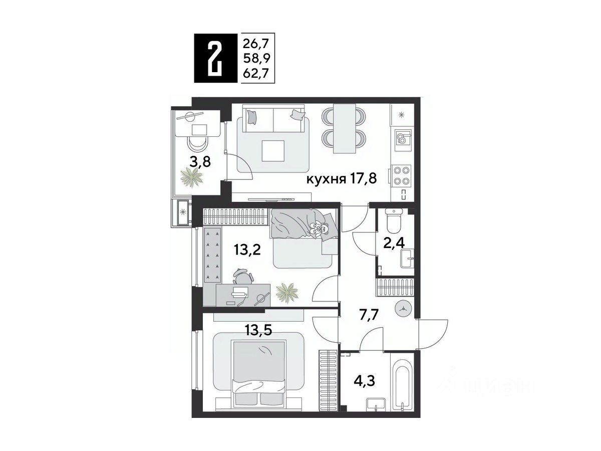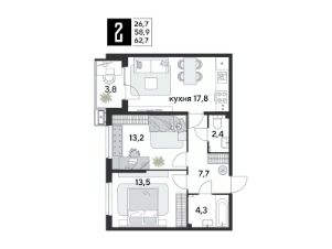 Срок сдачи: 1 кв. 2026, общей площадью 62.7 кв.м., на 2 этаже.