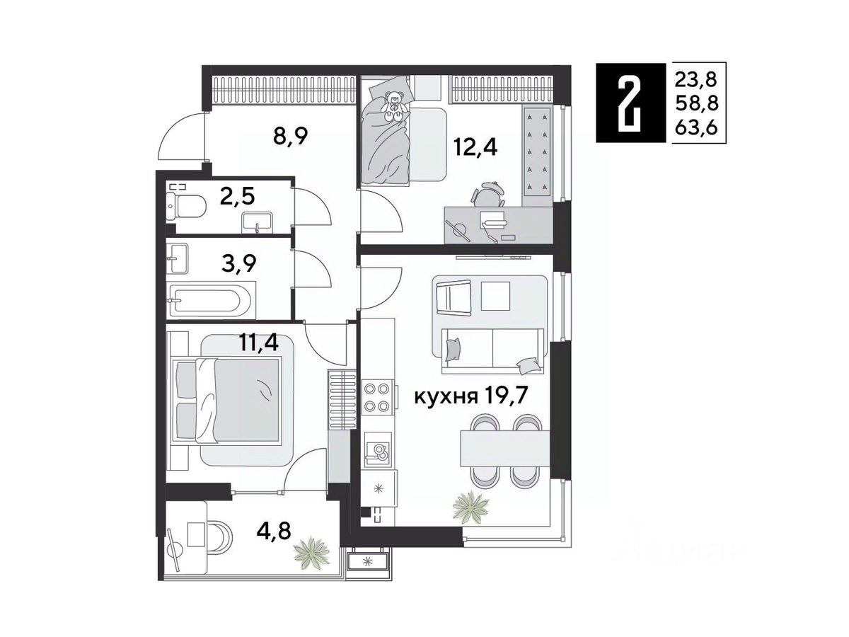 Срок сдачи: 1 кв. 2026, общей площадью 63.6 кв.м., на 2 этаже.