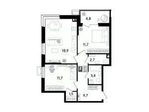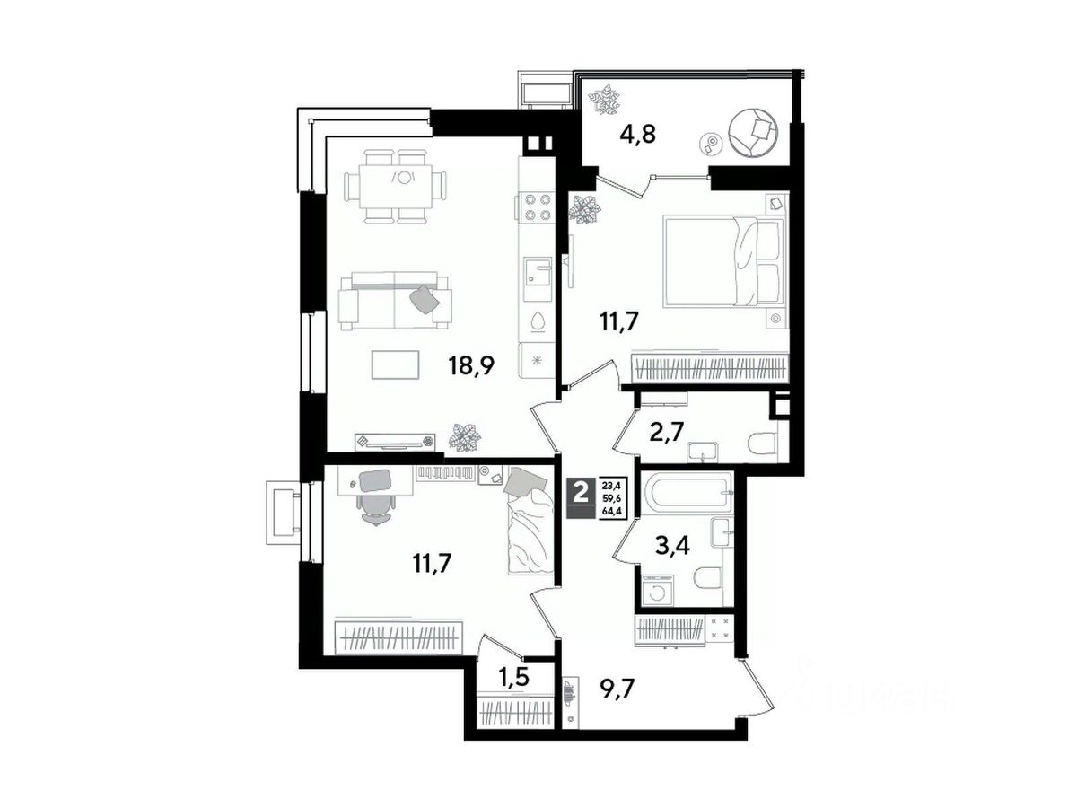 Срок сдачи: 1 кв. 2026, общей площадью 64.4 кв.м., на 5 этаже.