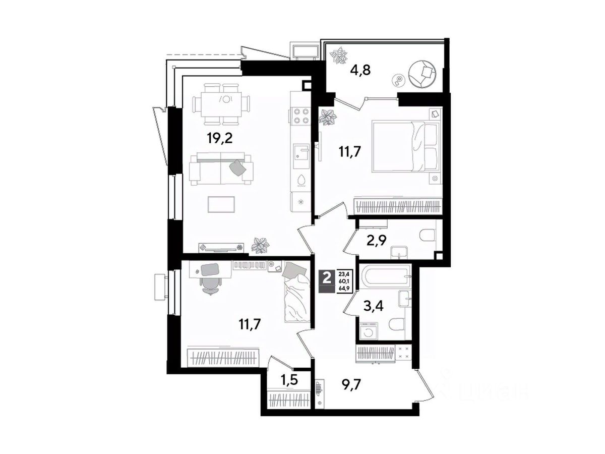 Срок сдачи: 1 кв. 2026, общей площадью 64.9 кв.м., на 2 этаже.