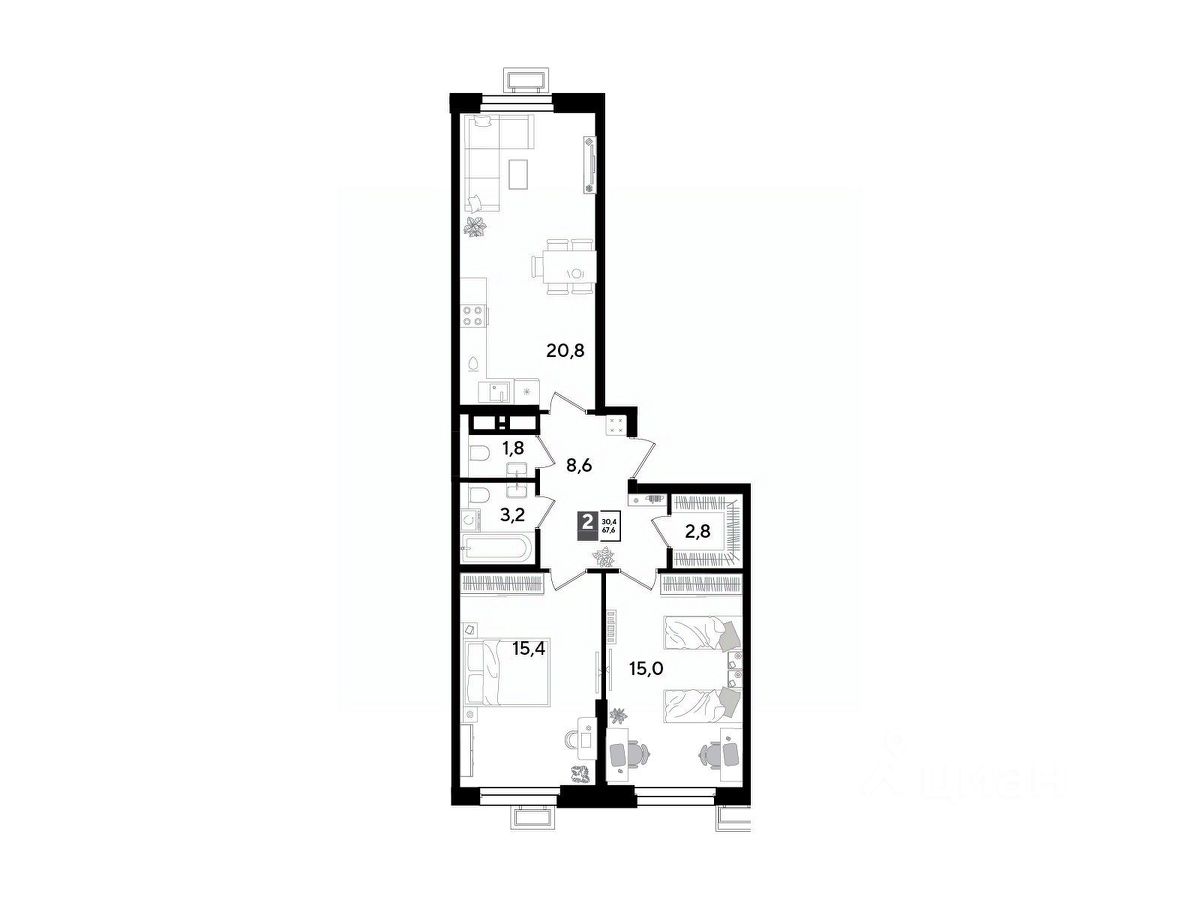 Срок сдачи: 1 кв. 2026, общей площадью 67.6 кв.м., на 11 этаже.