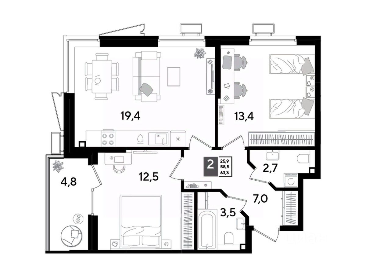 Срок сдачи: 1 кв. 2026, общей площадью 63.3 кв.м., на 2 этаже.