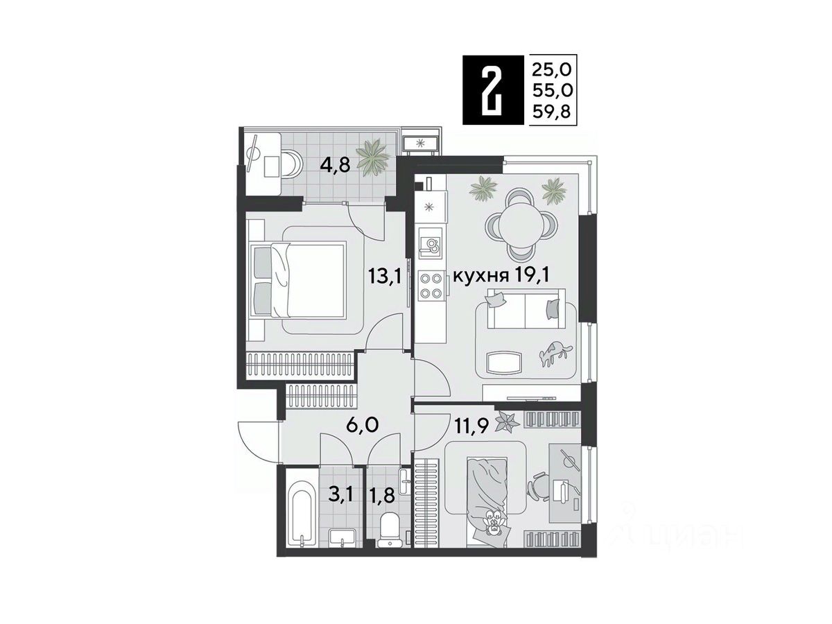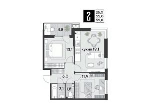 Срок сдачи: 1 кв. 2026, общей площадью 59.8 кв.м., на 2 этаже.