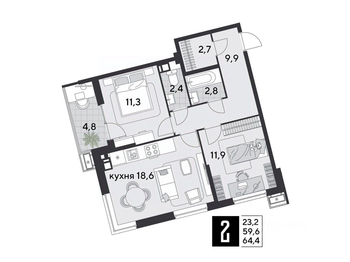 Срок сдачи: 1 кв. 2026, общей площадью 64.4 кв.м., на 4 этаже.
