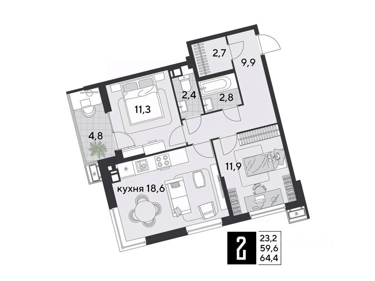 Срок сдачи: 1 кв. 2026, общей площадью 64.4 кв.м., на 9 этаже.