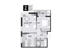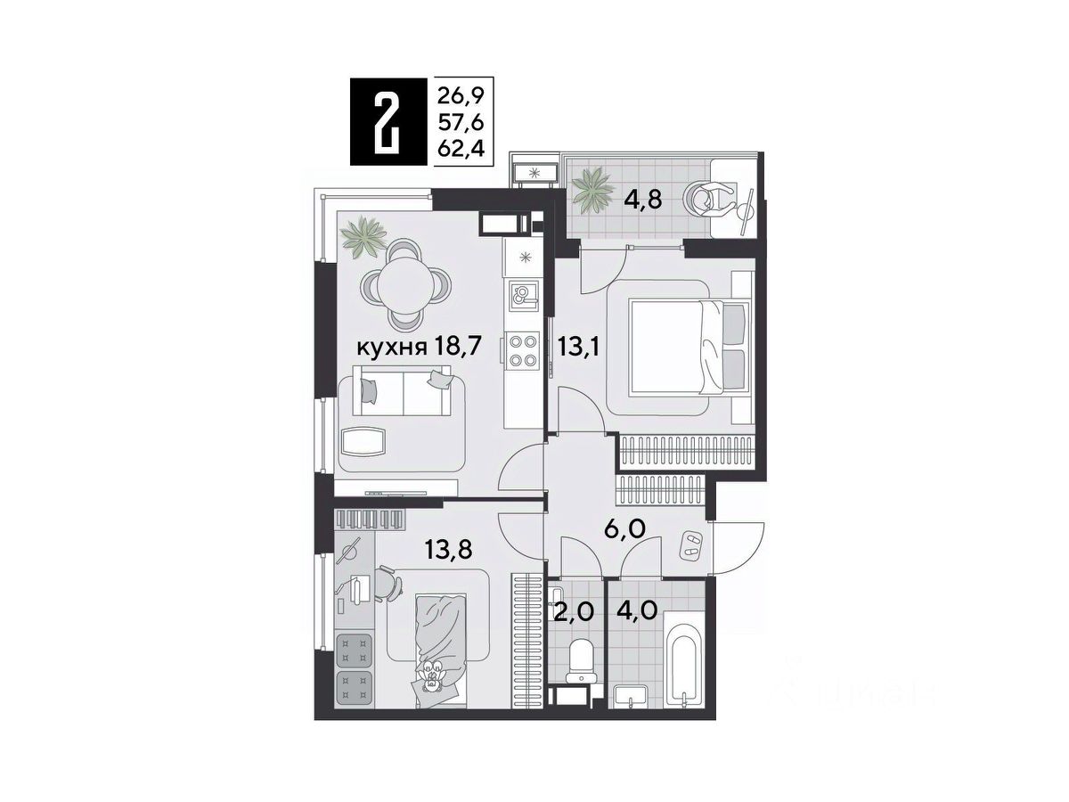 Срок сдачи: 1 кв. 2026, общей площадью 62.4 кв.м., на 10 этаже.