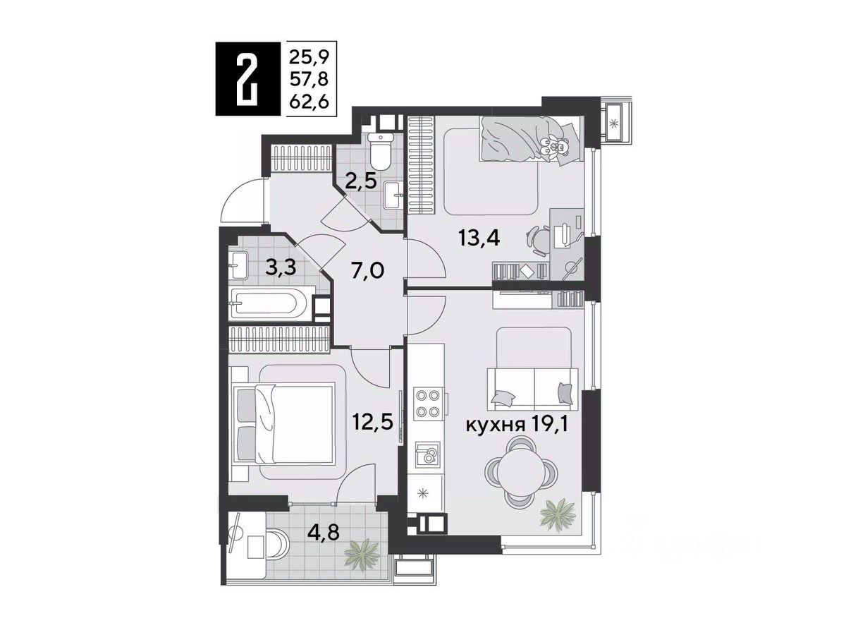Срок сдачи: 1 кв. 2026, общей площадью 62.6 кв.м., на 6 этаже.