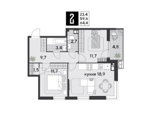 Срок сдачи: 1 кв. 2026, общей площадью 64.4 кв.м., на 4 этаже.