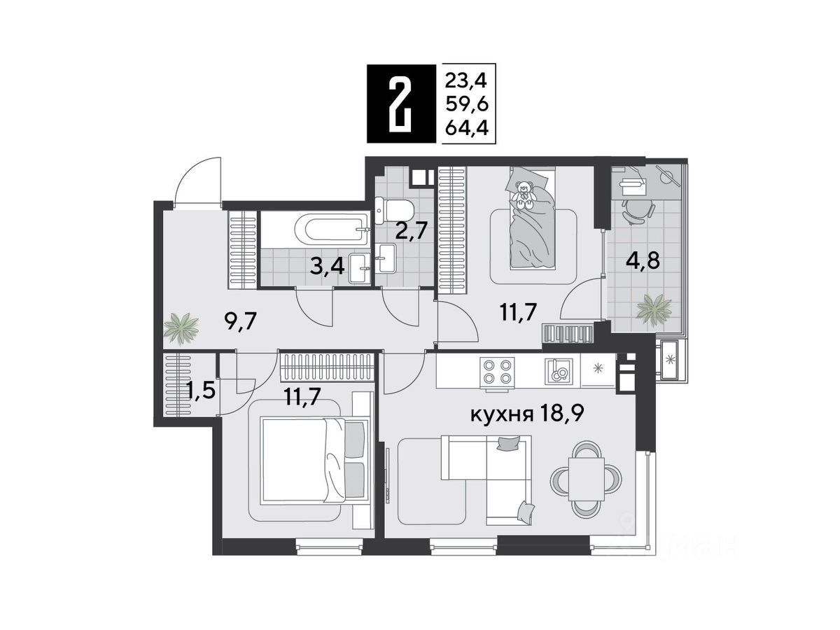 Срок сдачи: 1 кв. 2026, общей площадью 64.4 кв.м., на 9 этаже.