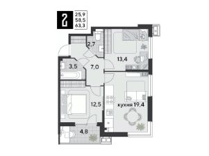Срок сдачи: 1 кв. 2026, общей площадью 63.3 кв.м., на 2 этаже.