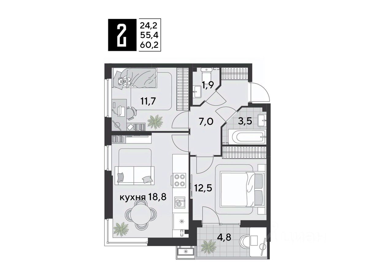 Срок сдачи: 1 кв. 2026, общей площадью 60.2 кв.м., на 2 этаже.
