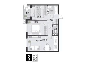 Срок сдачи: 1 кв. 2026, общей площадью 64.6 кв.м., на 4 этаже.