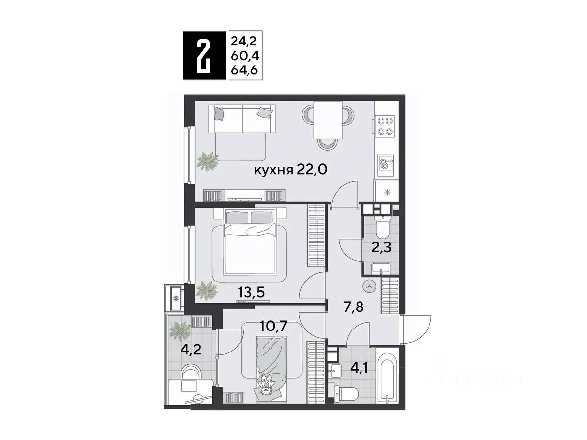 Срок сдачи: 1 кв. 2026, общей площадью 64.6 кв.м., на 6 этаже.