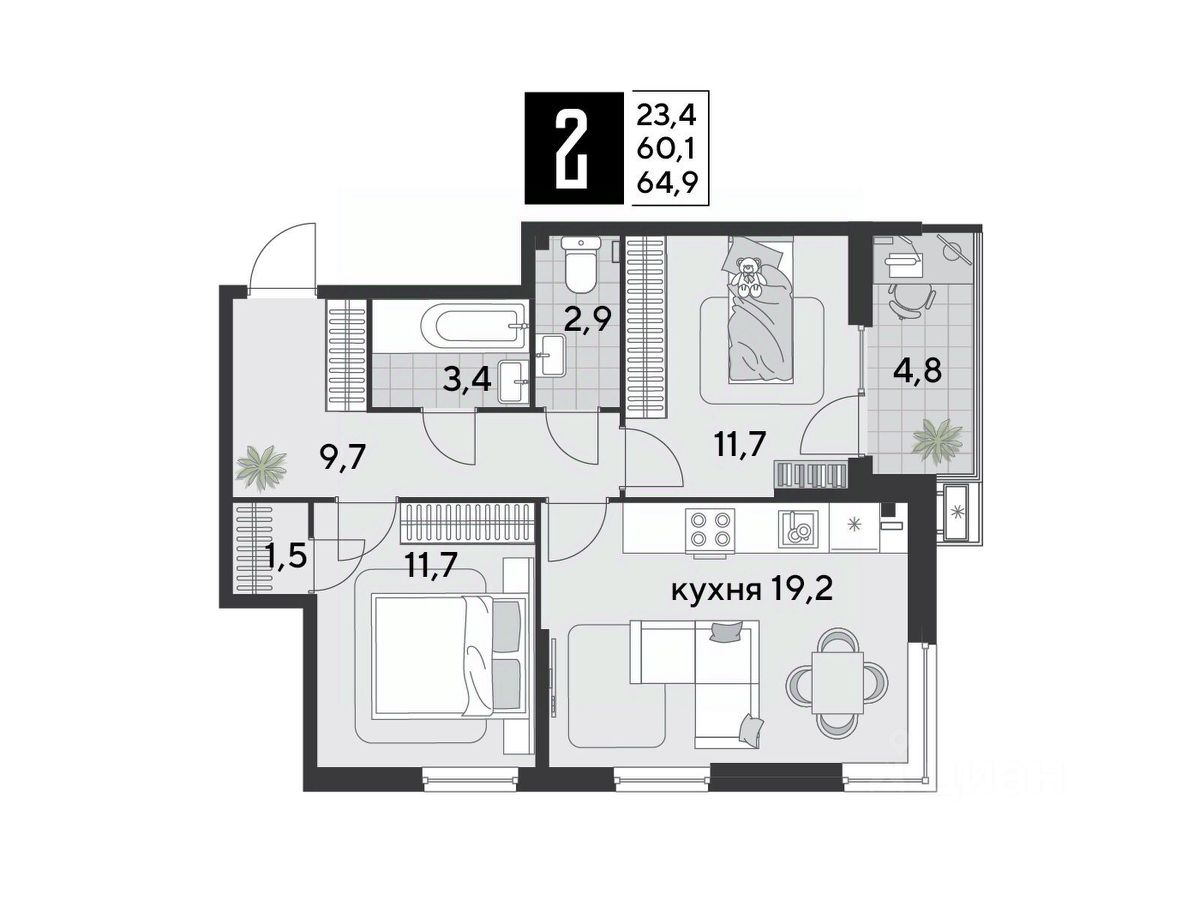 Срок сдачи: 1 кв. 2026, общей площадью 64.9 кв.м., на 2 этаже.