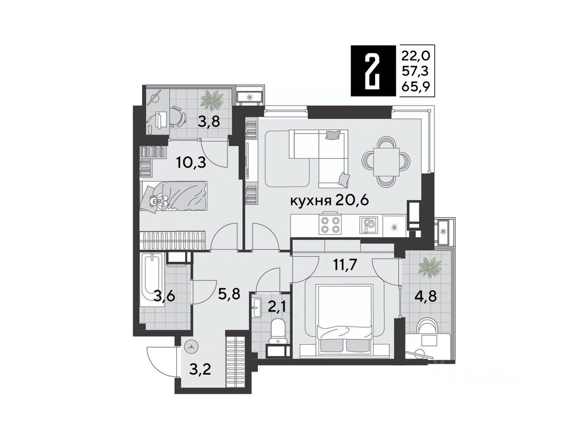 Срок сдачи: 1 кв. 2026, общей площадью 65.9 кв.м., на 10 этаже.