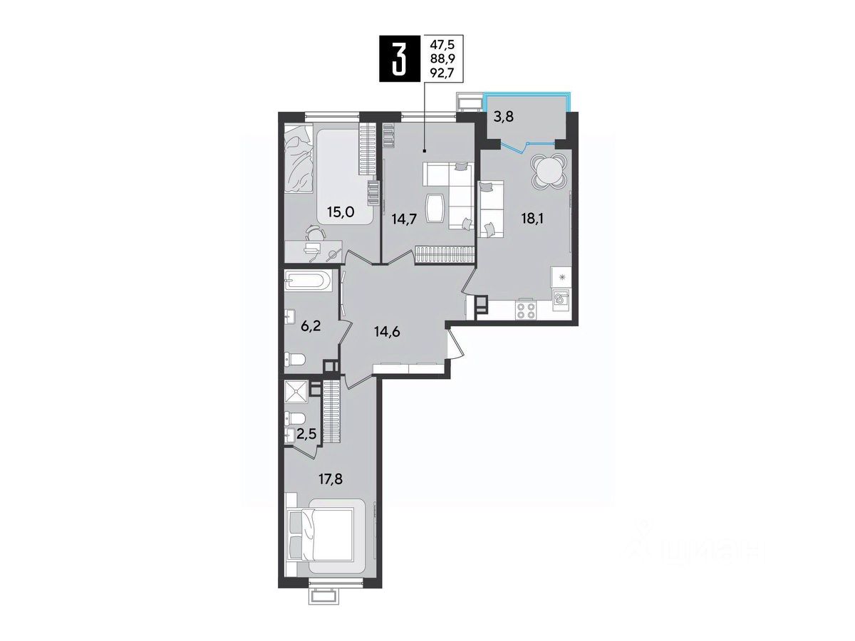 Срок сдачи: 4 кв. 2025, общей площадью 92.7 кв.м., на 7 этаже.