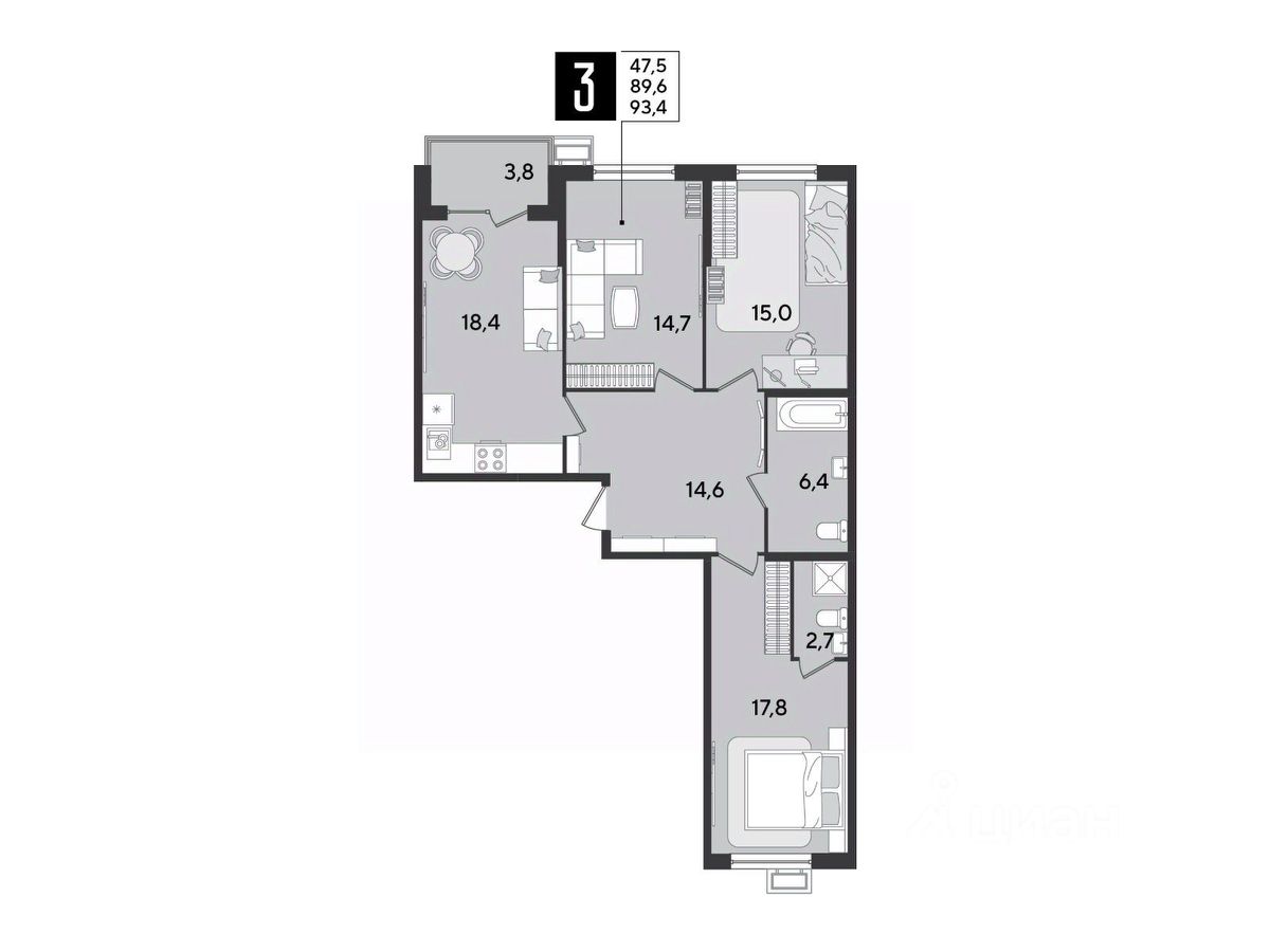 Срок сдачи: 4 кв. 2025, общей площадью 93.4 кв.м., на 2 этаже.