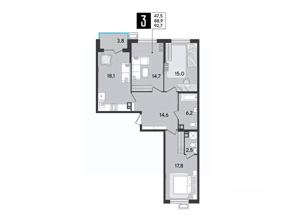 Срок сдачи: 4 кв. 2025, общей площадью 92.7 кв.м., на 8 этаже.