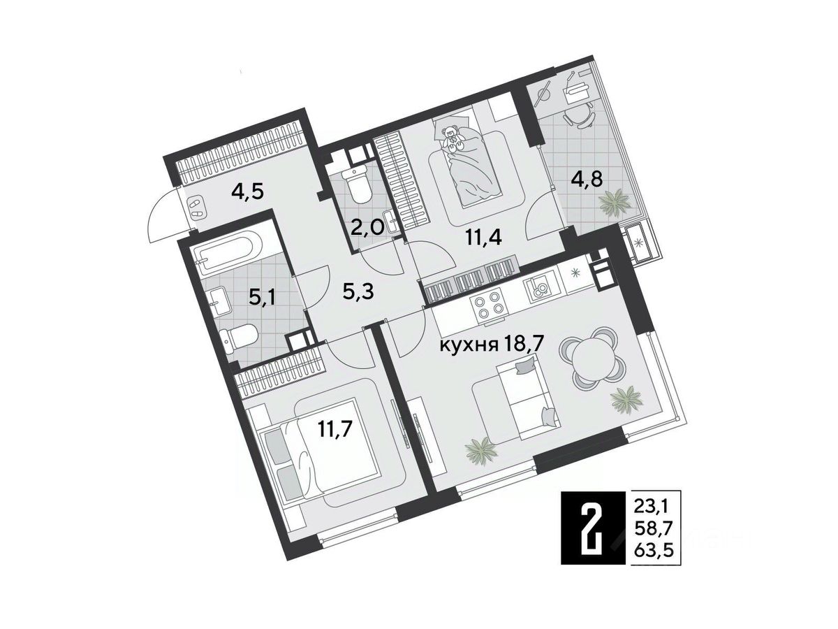 Срок сдачи: 1 кв. 2026, общей площадью 63.5 кв.м., на 8 этаже.