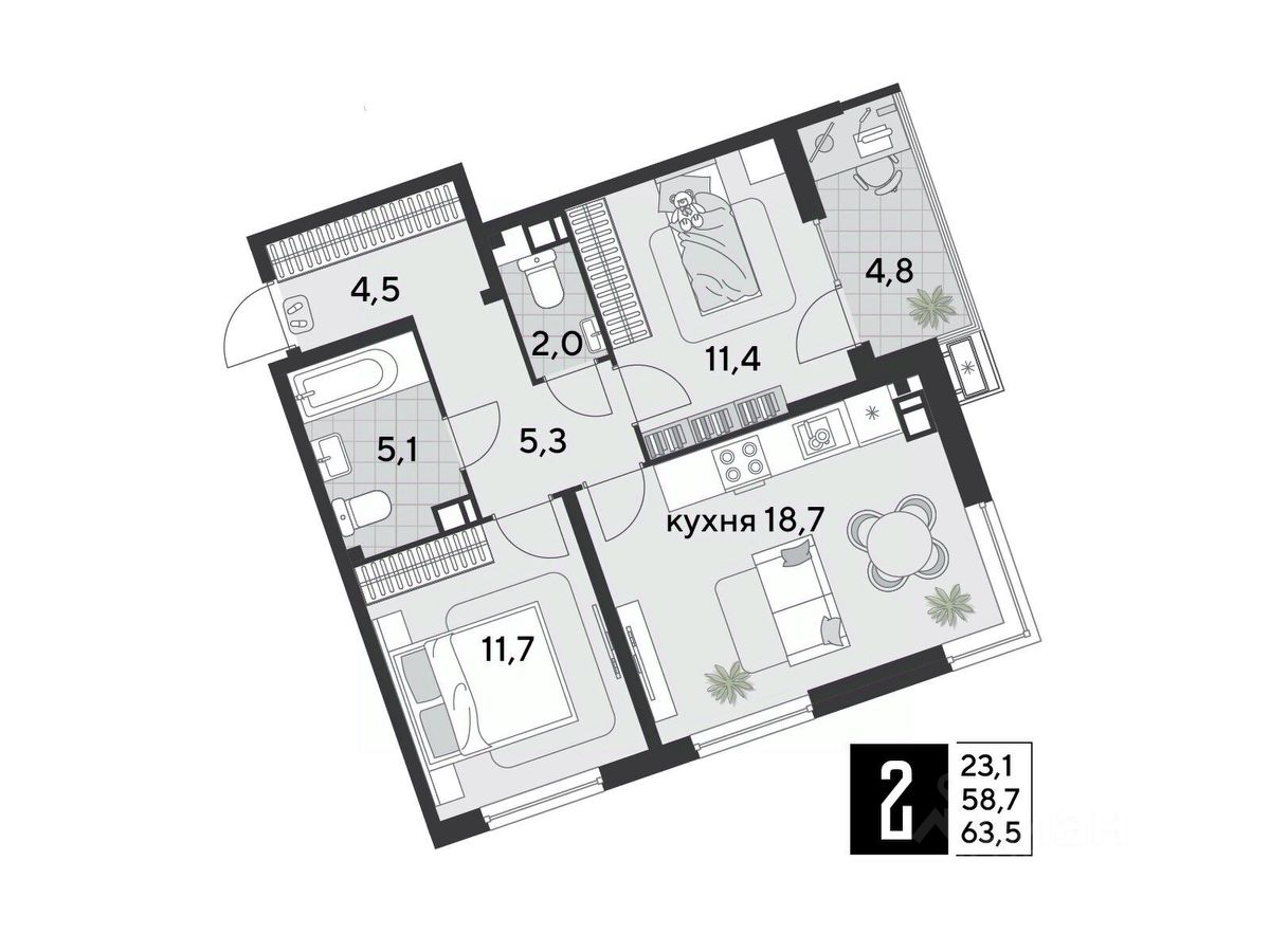 Срок сдачи: 1 кв. 2026, общей площадью 63.5 кв.м., на 6 этаже.