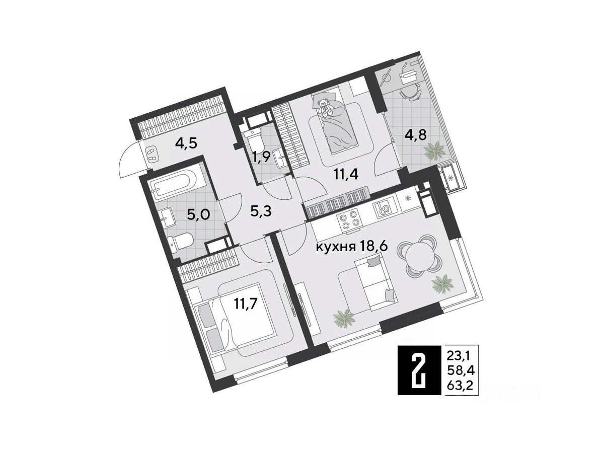 Срок сдачи: 1 кв. 2026, общей площадью 63.2 кв.м., на 10 этаже.