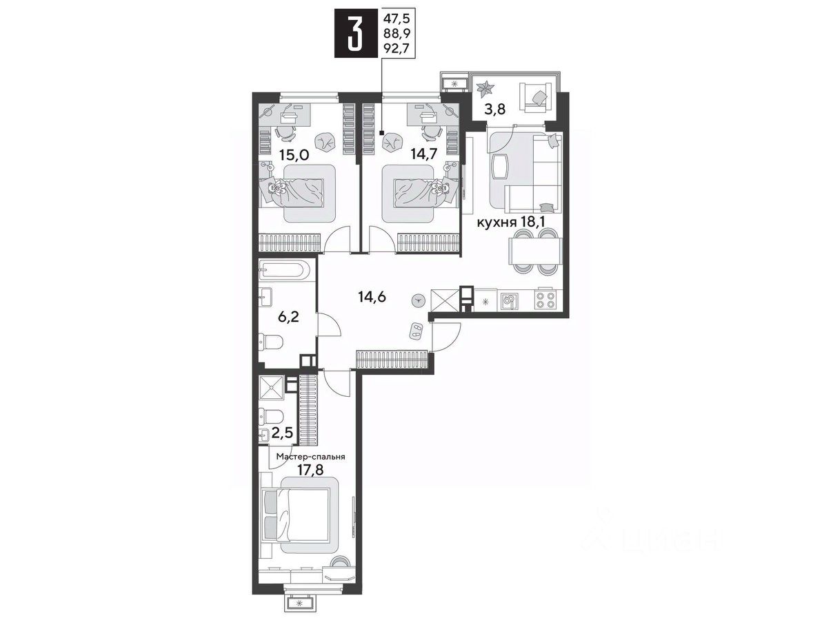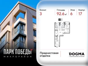 Срок сдачи: 1 кв. 2026, общей площадью 92.6 кв.м., на 6 этаже.