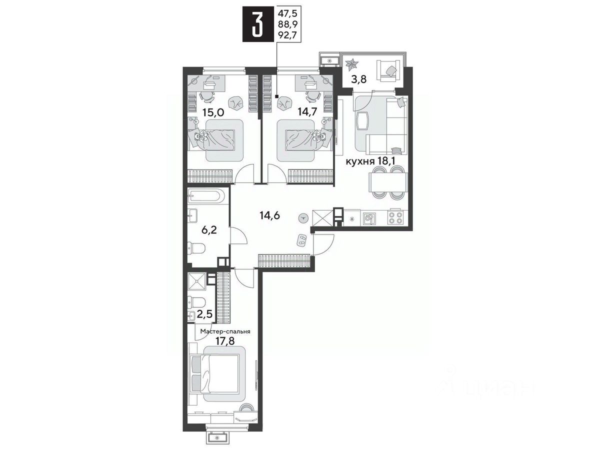 Срок сдачи: 1 кв. 2026, общей площадью 92.6 кв.м., на 3 этаже.