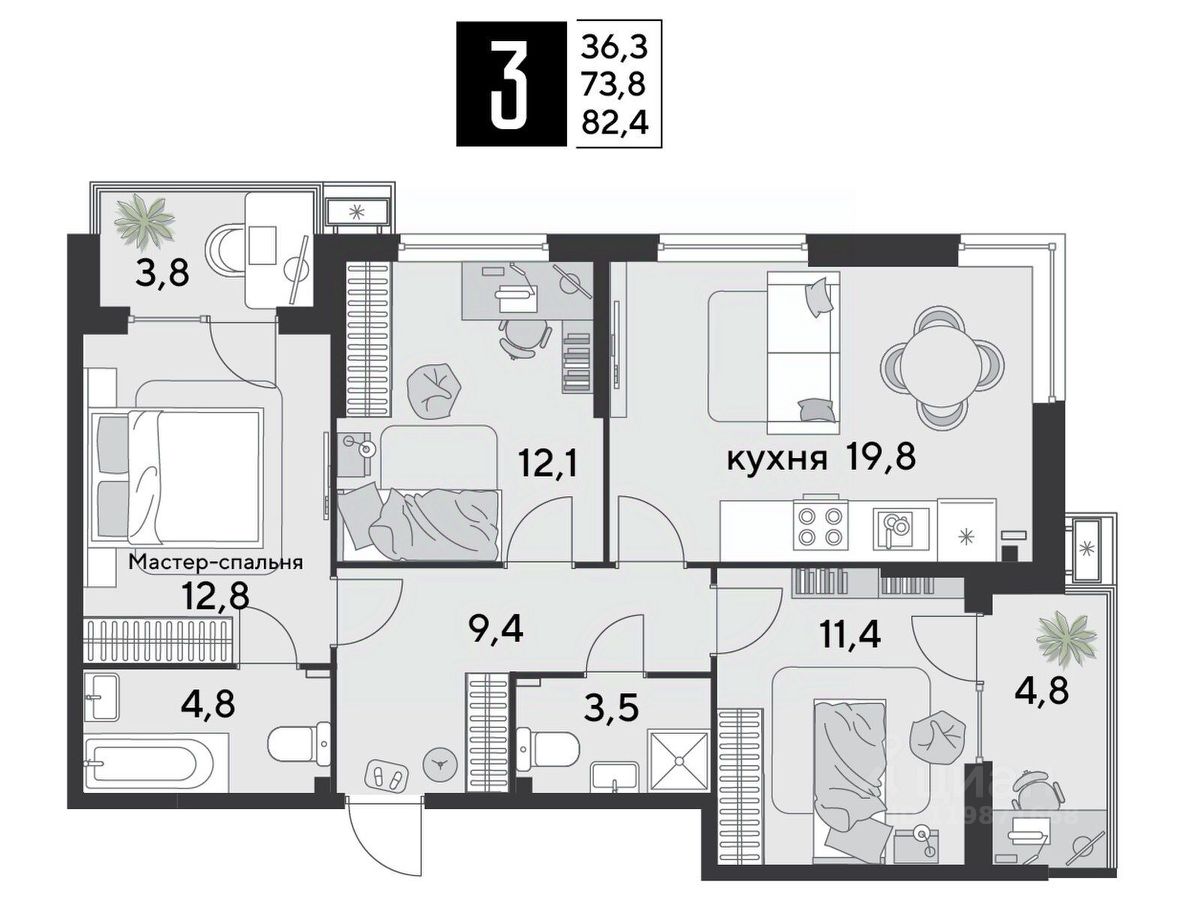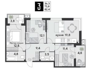 Срок сдачи: 1 кв. 2026, общей площадью 82.4 кв.м., на 6 этаже.