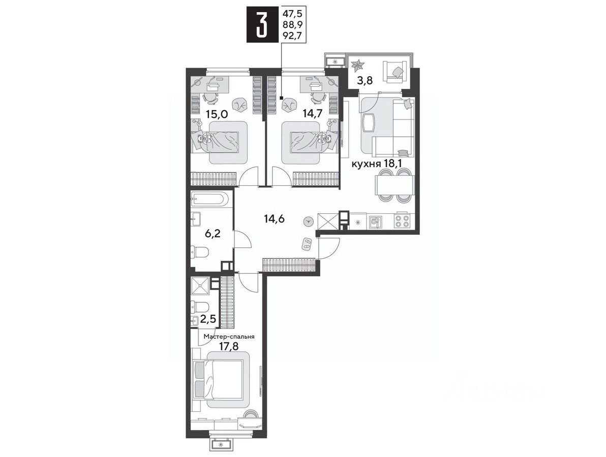 Срок сдачи: 1 кв. 2026, общей площадью 92.4 кв.м., на 9 этаже.