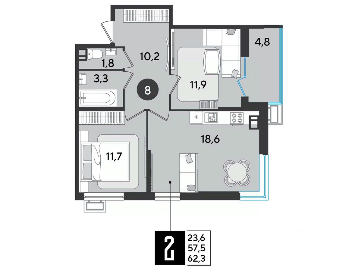 Срок сдачи: 1 кв. 2026, общей площадью 62.3 кв.м., на 4 этаже.