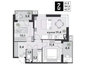 Срок сдачи: 1 кв. 2026, общей площадью 62.9 кв.м., на 2 этаже.