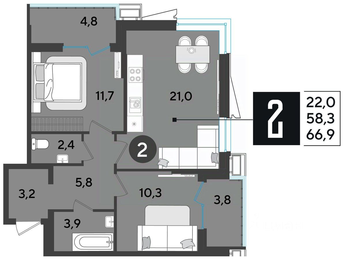 Срок сдачи: 1 кв. 2026, общей площадью 67.4 кв.м., на 2 этаже.