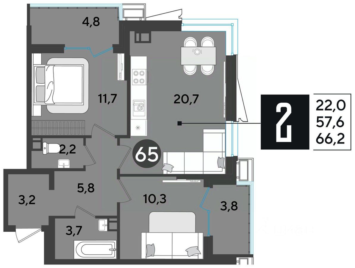 Срок сдачи: 1 кв. 2026, общей площадью 66.8 кв.м., на 4 этаже.
