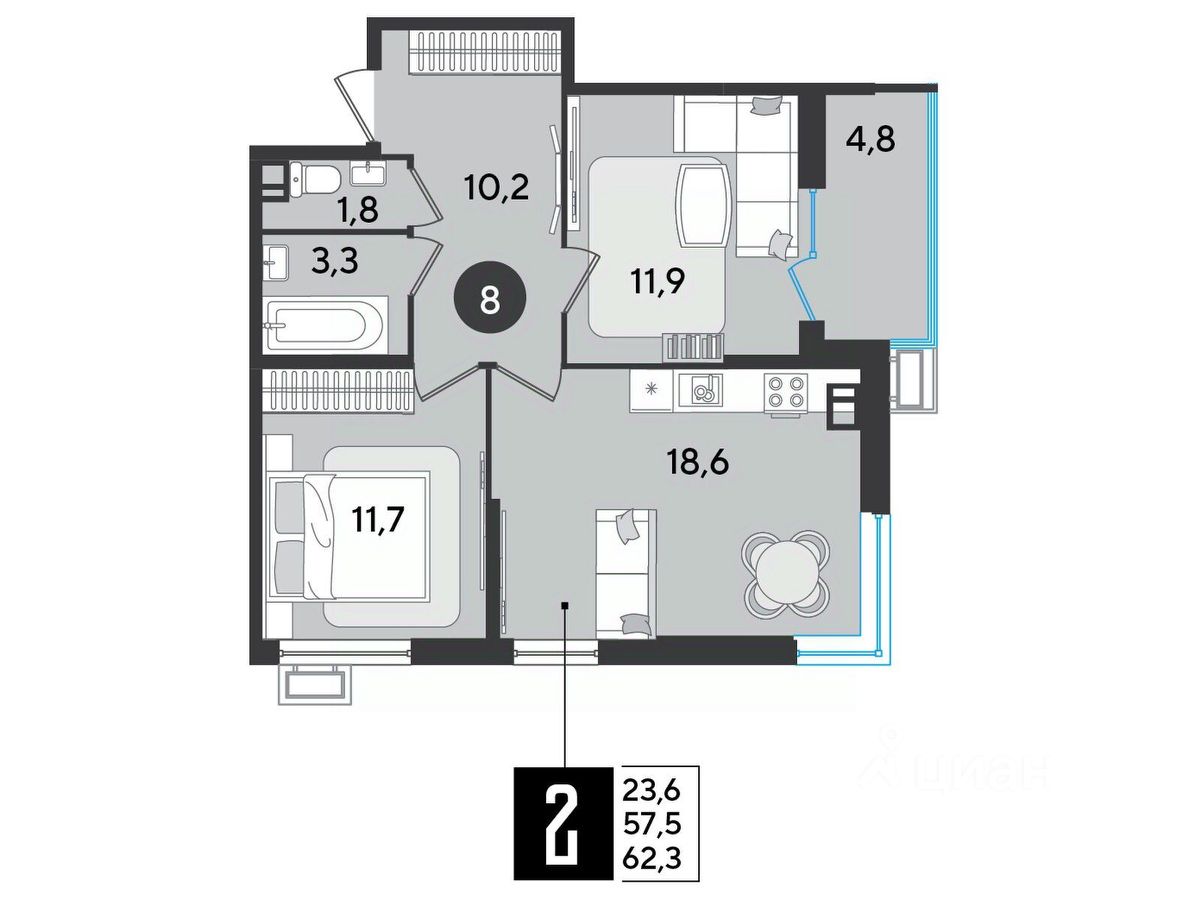 Срок сдачи: 1 кв. 2026, общей площадью 62.3 кв.м., на 5 этаже.