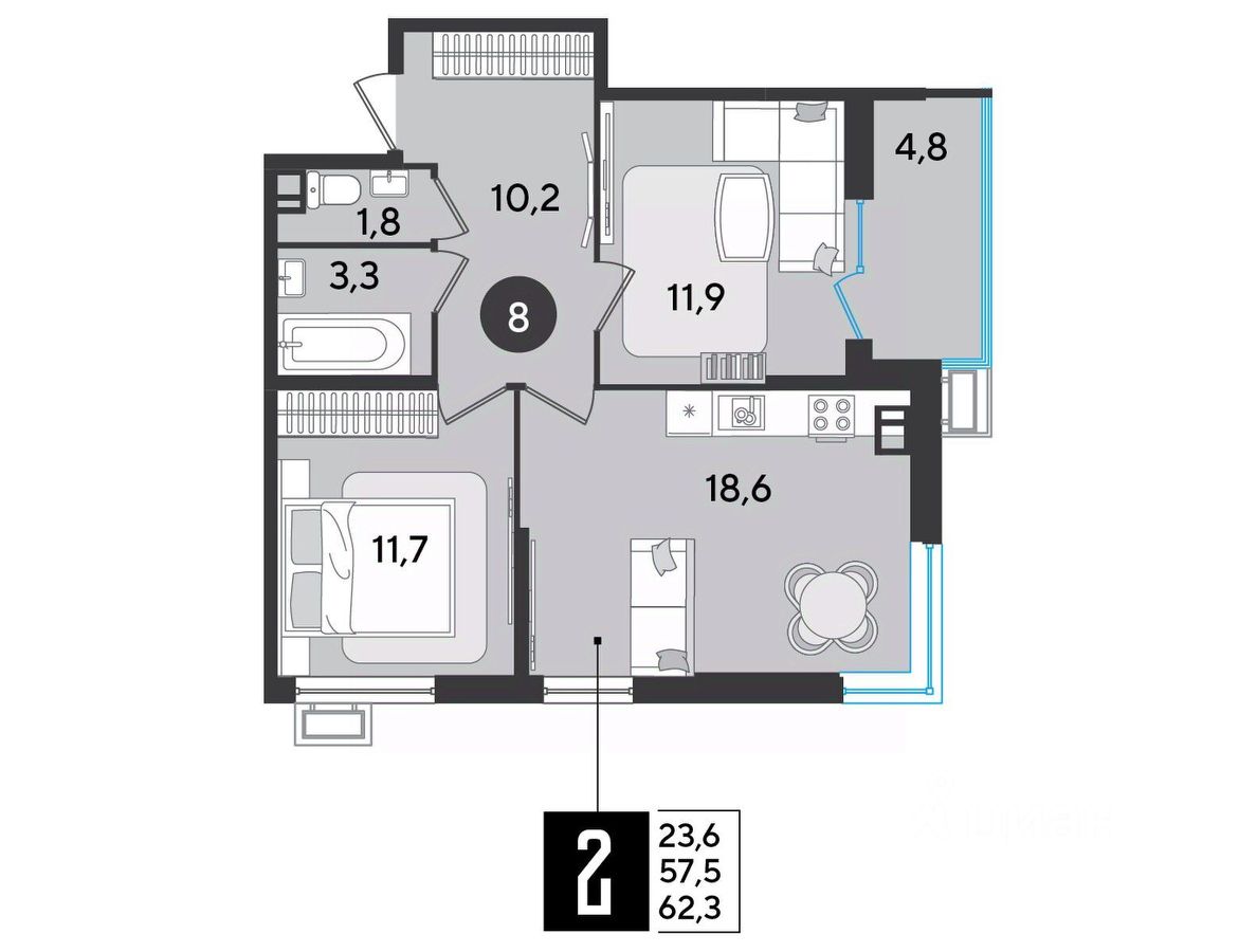 Срок сдачи: 1 кв. 2026, общей площадью 62.3 кв.м., на 3 этаже.