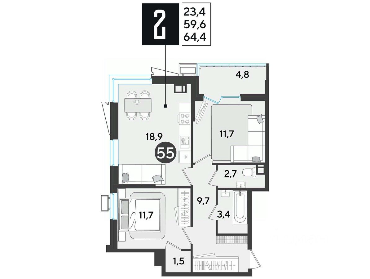 Срок сдачи: 1 кв. 2026, общей площадью 63.7 кв.м., на 3 этаже.