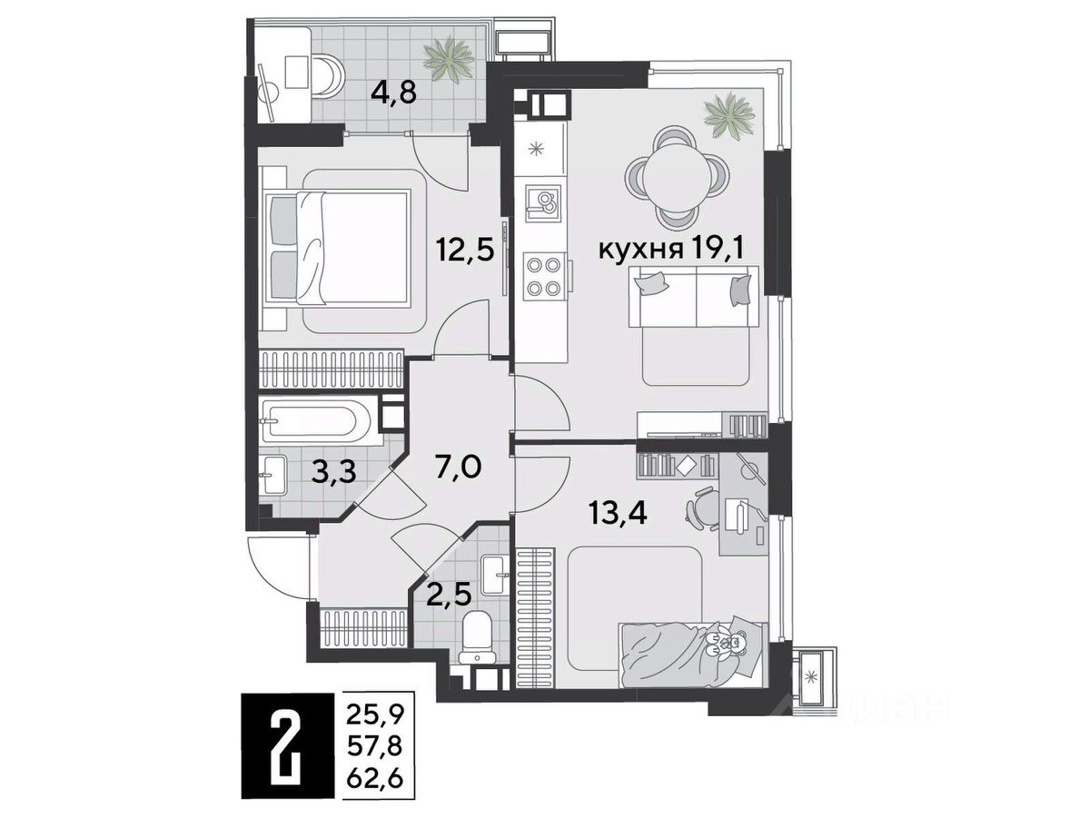Срок сдачи: 1 кв. 2026, общей площадью 62.2 кв.м., на 6 этаже.