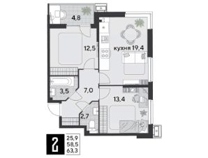 Срок сдачи: 1 кв. 2026, общей площадью 62.8 кв.м., на 7 этаже.