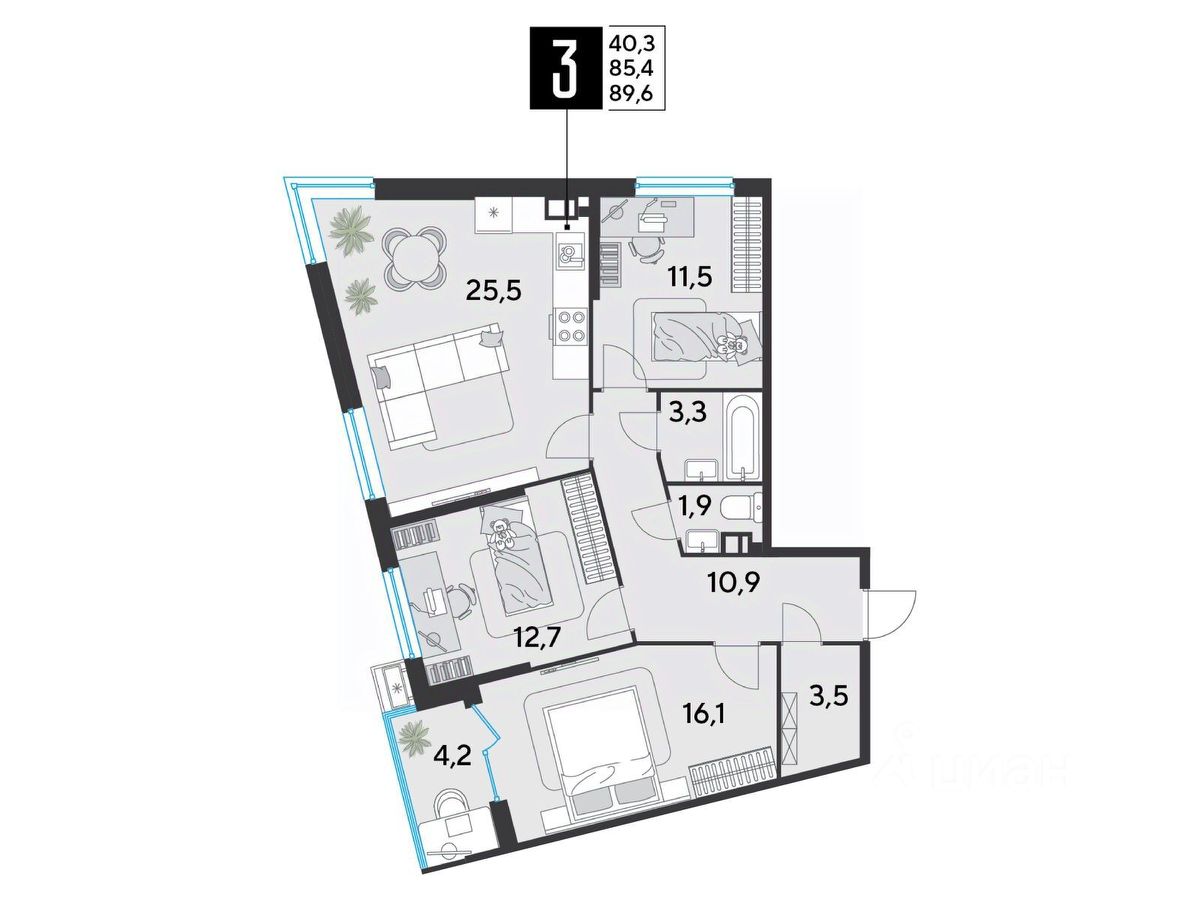 Срок сдачи: 2 кв. 2026, общей площадью 89.6 кв.м., на 3 этаже.