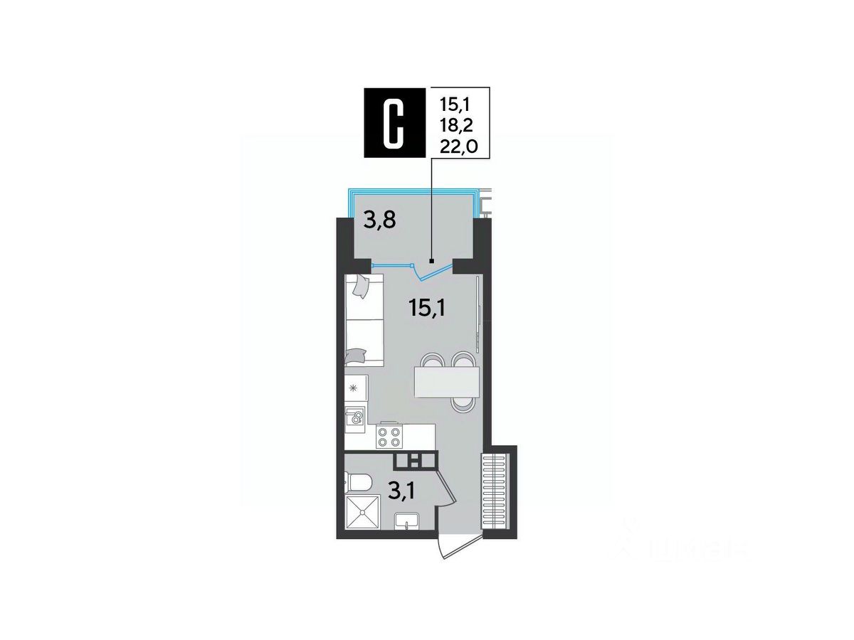 Срок сдачи: 2 кв. 2026, общей площадью 22 кв.м., на 3 этаже.
