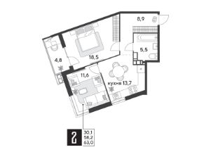 Срок сдачи: 1 кв. 2026, общей площадью 63 кв.м., на 11 этаже.