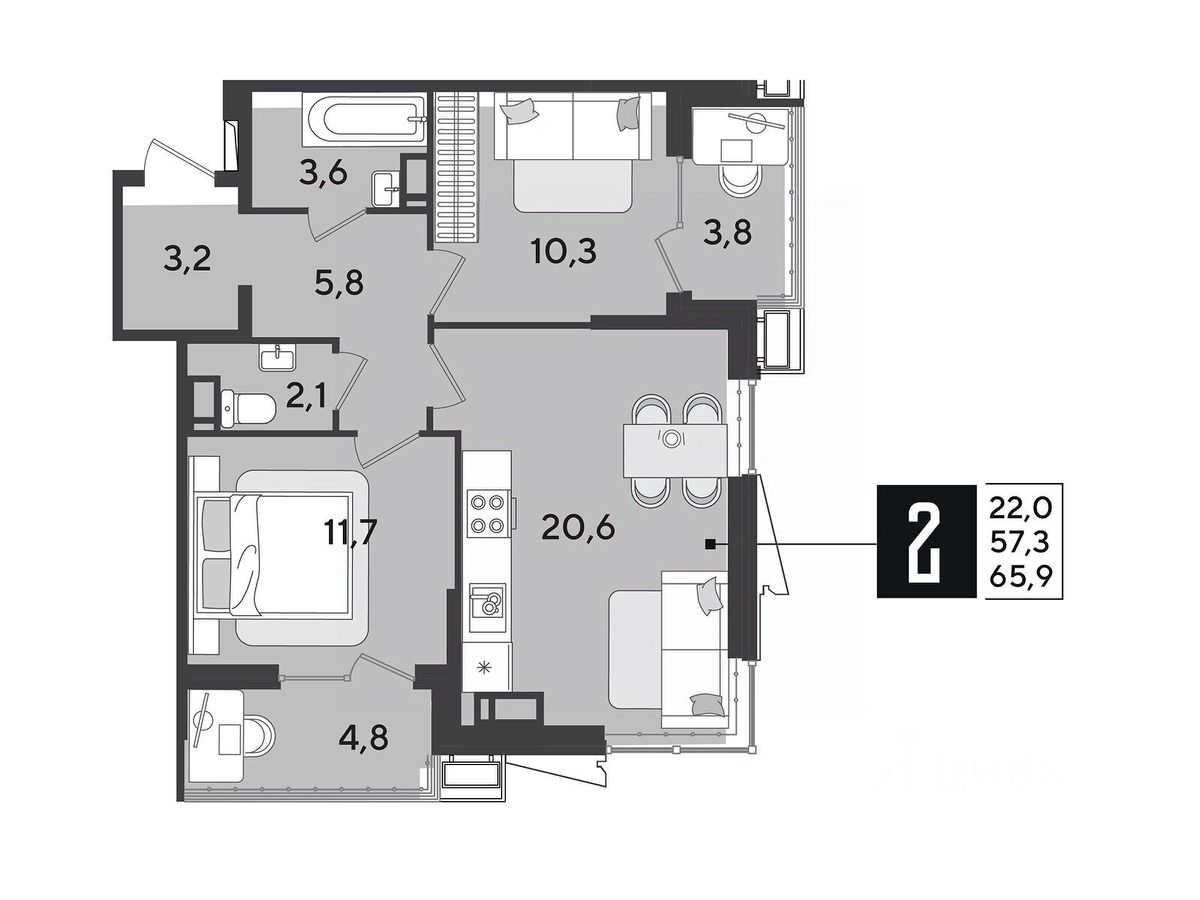 Срок сдачи: 1 кв. 2026, общей площадью 65.9 кв.м., на 10 этаже.