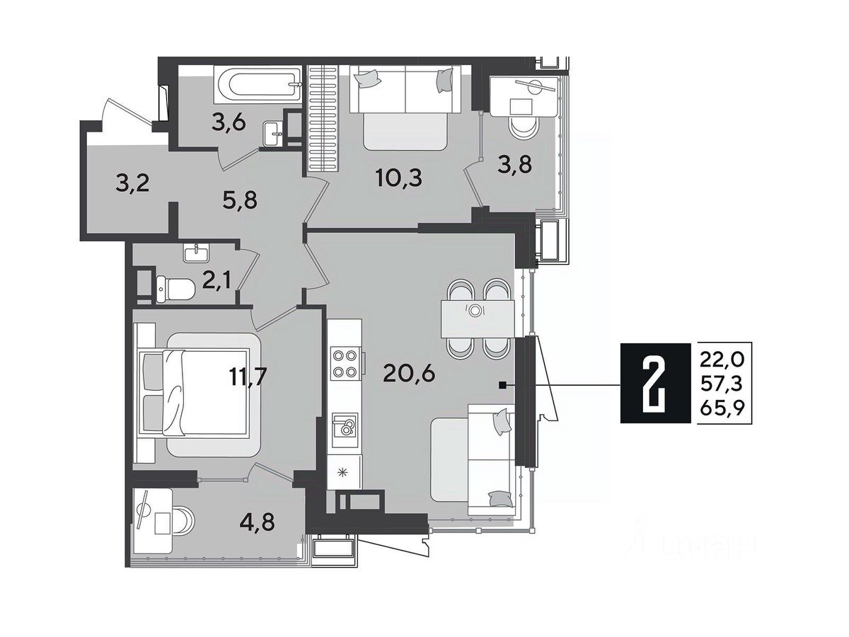 Срок сдачи: 1 кв. 2026, общей площадью 65.9 кв.м., на 11 этаже.