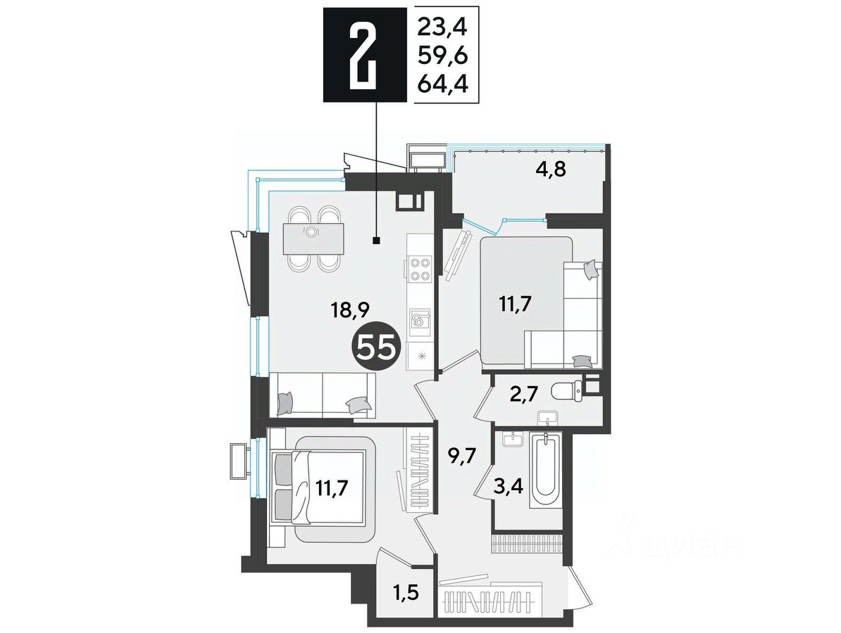 Срок сдачи: 1 кв. 2026, общей площадью 63.7 кв.м., на 8 этаже.