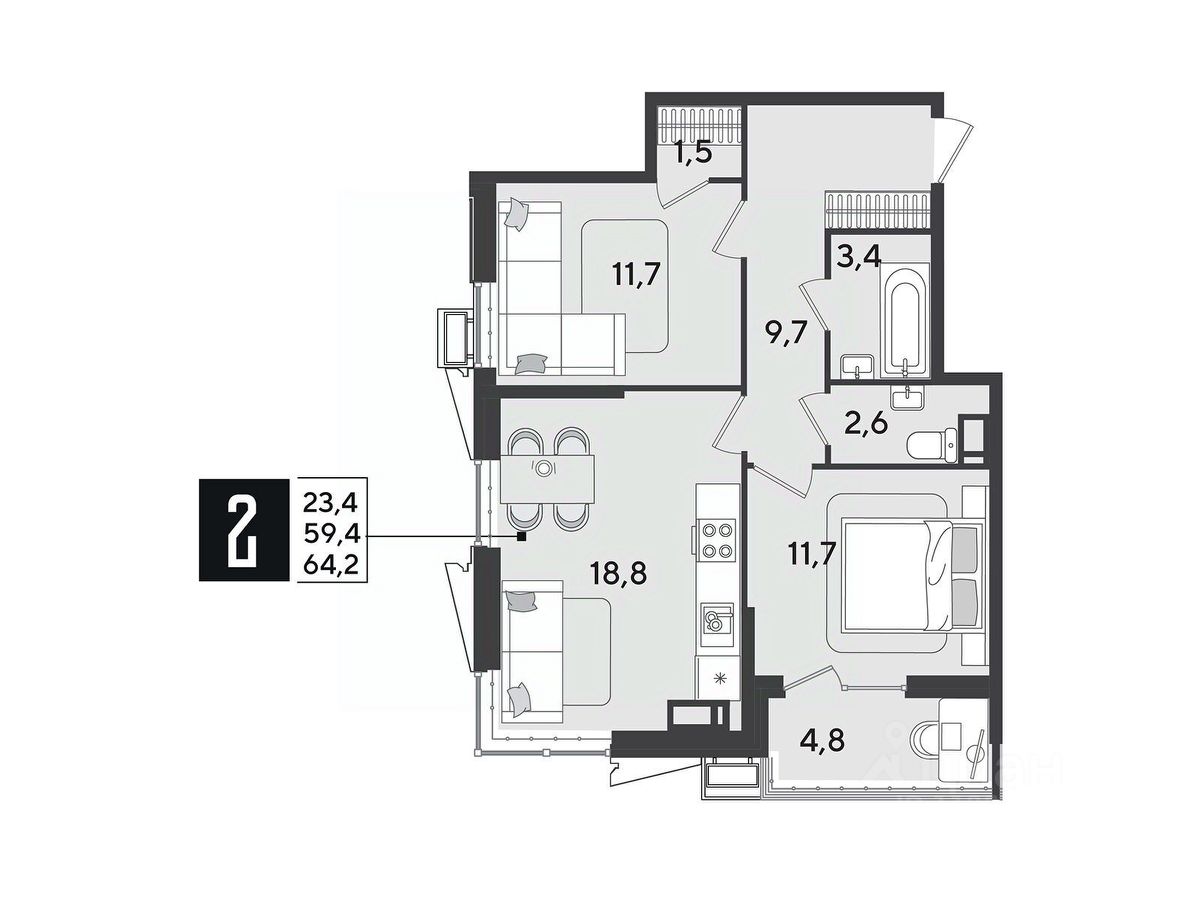 Срок сдачи: 1 кв. 2026, общей площадью 64.2 кв.м., на 11 этаже.
