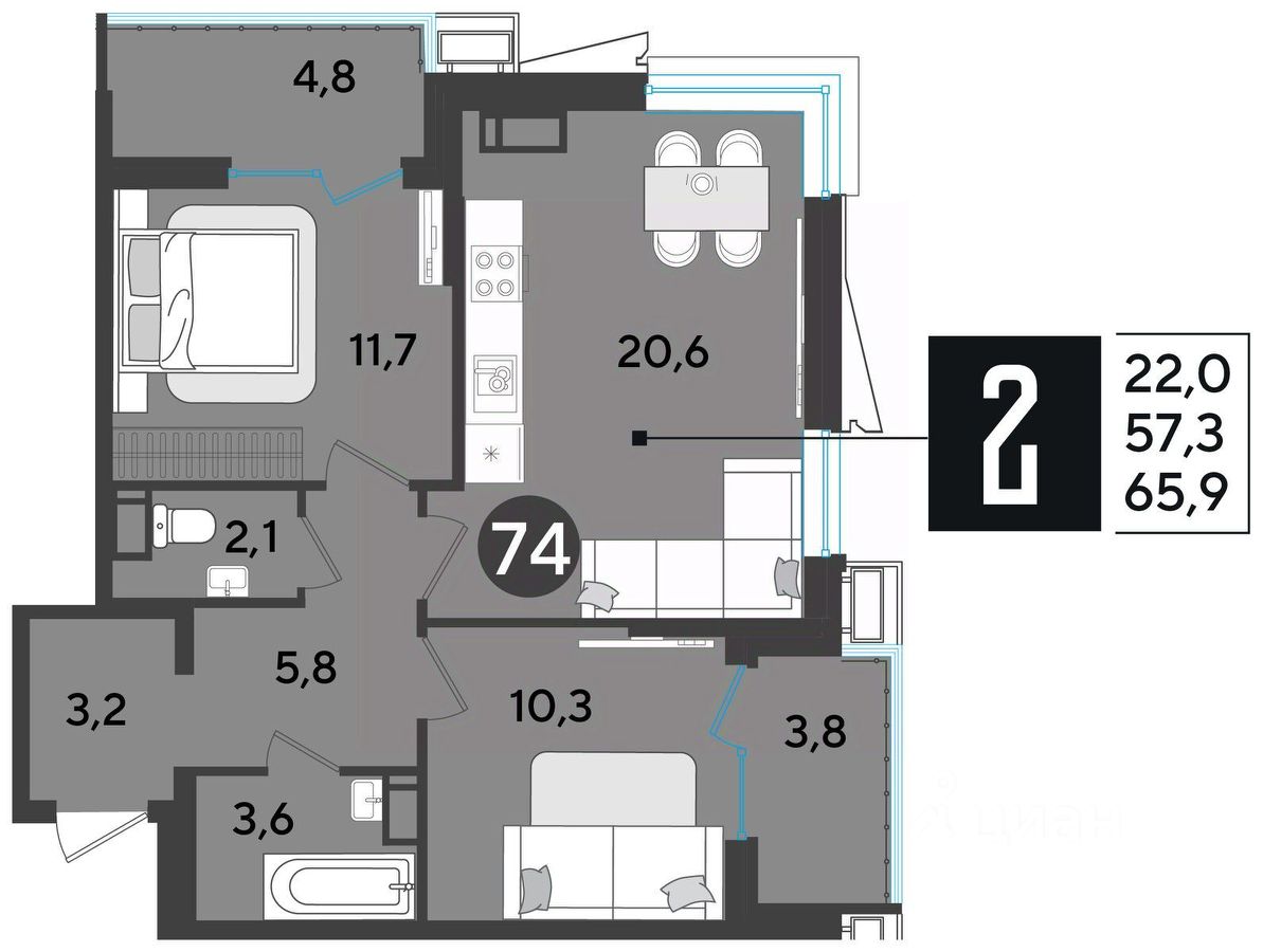 Срок сдачи: 1 кв. 2026, общей площадью 66.1 кв.м., на 10 этаже.
