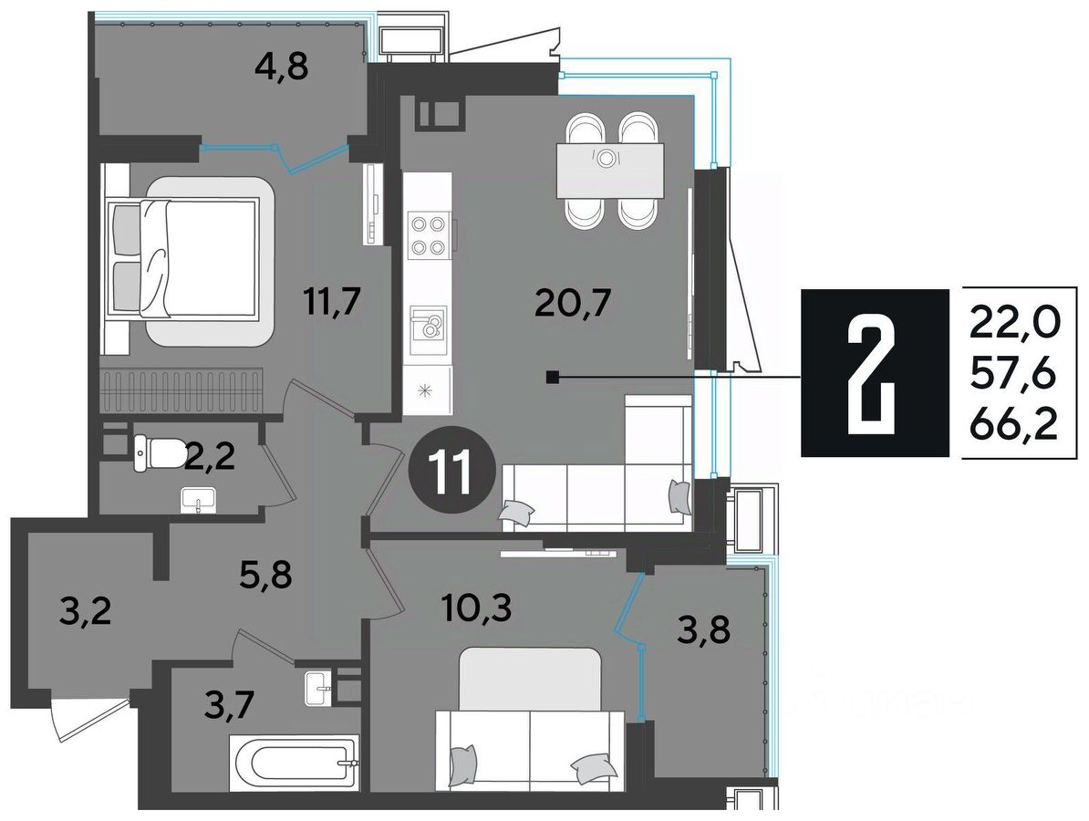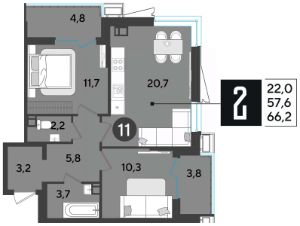 Срок сдачи: 1 кв. 2026, общей площадью 66.6 кв.м., на 11 этаже.