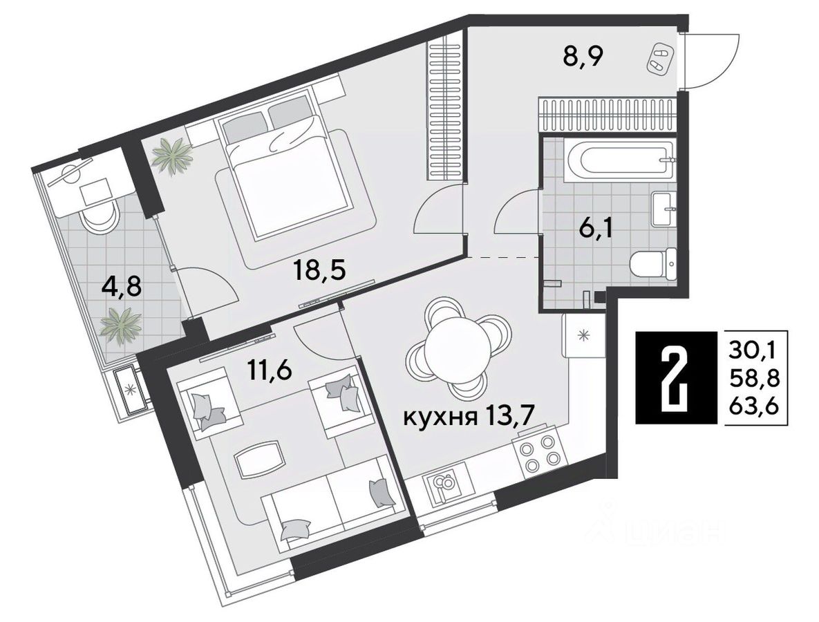 1 кв. 2026, общей площадью 63.6 кв.м., на 2 этаже.