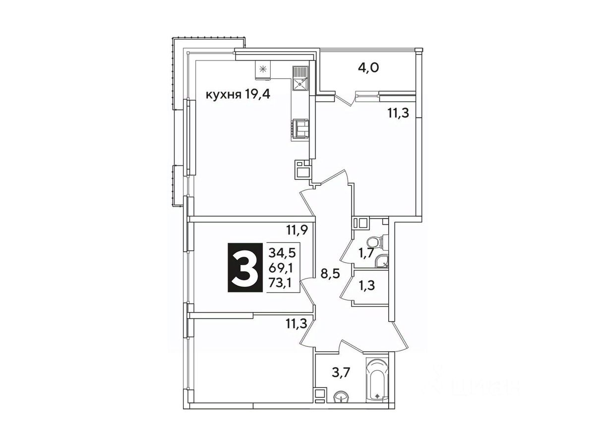 Площадь кухни19,4 м²