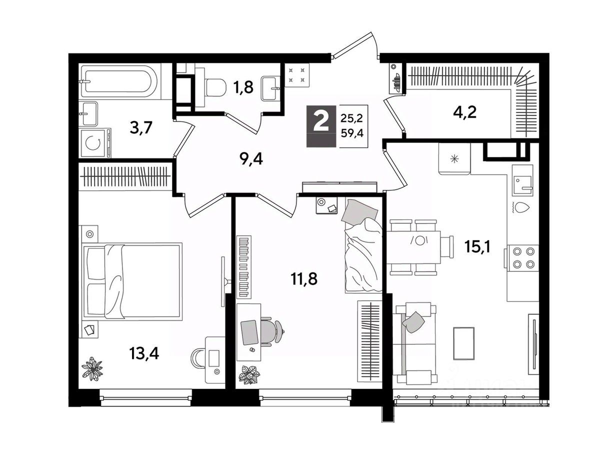 В продаже 2-комнатная квартира от застройщика! Мкр. "DOGMA PARK" г. Краснодар, Литер 34 Срок сдачи: 4 кв. 2027, общей площадью 59.4 кв.м., на 12 этаже.